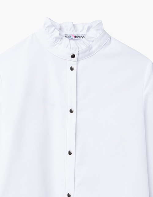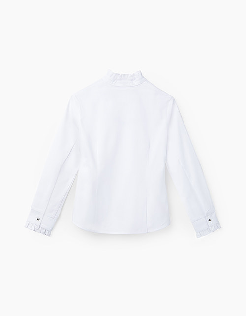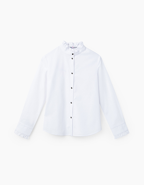 Полуприлегающая белая блузка из сорочечной ткани с эластаном. Воротник и невысокий манжет украшены рюшкой. Центральная застёжка на сорочечные книпперы из металла.
