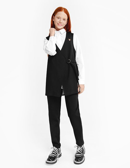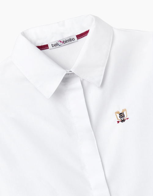 Белая блузка прямого силуэта, с длинным рукавом, удлиненной спинкой, с застежкой на пуговицы. Выполнена из сорочечной ткани. Декорирована фирменной вышивкой с изображением совы, стрелы и открытой книги. Отделка контрастной тесьмой внутри горловины.