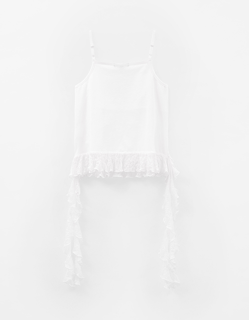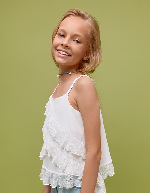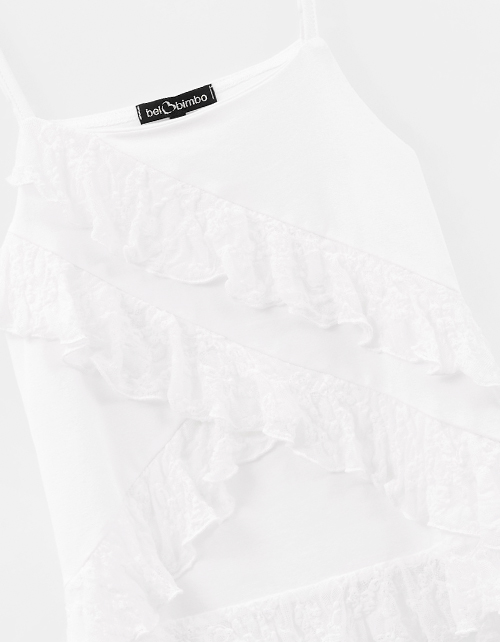 Блузка белого цвета в стиле бохо на регулируемых бретелях для девочки. Прилегающий силуэт подчёркивает посадку. Романтичные воланы из кружева. Внутри - двойной топ из кулирной глади: не просвечивает.