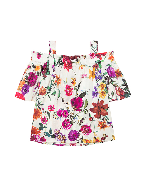 Для жаркого лета просто необходима милая комфортная блузка с отрытыми плечиками. Прелестная рюша придает изделию игривость и легкость. Пестрые летние цветы украсят Вашу красавицу. Подарите ей прекрасное солнечное настроение