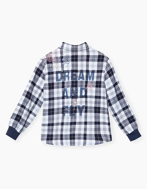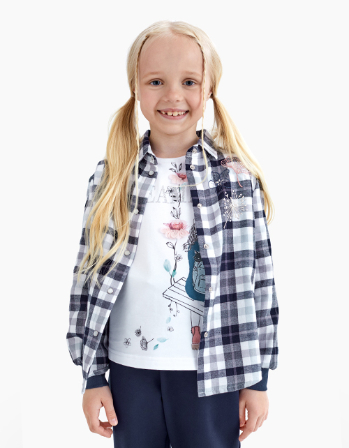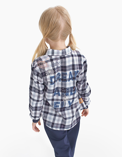 Клетчатая фланелевая рубашка прямого силуэта с длинным рукавом на манжетах из рибаны. C удобной застёжкой на перламутровых книпперах. Украшена вышивкой со стразами спереди и сзади, текстовым принтом на спине.