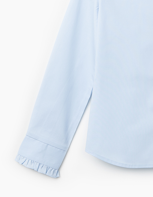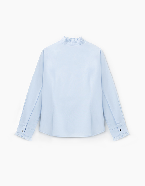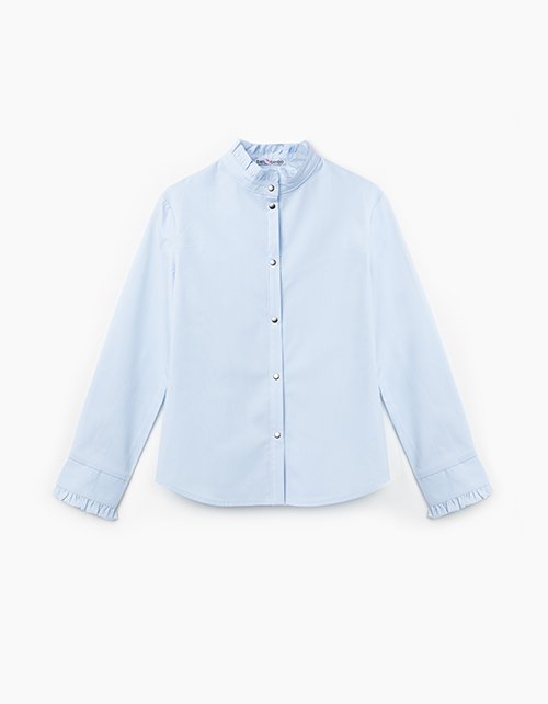 Полуприлегающая голубая блузка из сорочечной ткани с эластаном. Воротник и невысокий манжет украшены рюшкой. Центральная застёжка на сорочечные книпперы из металла.