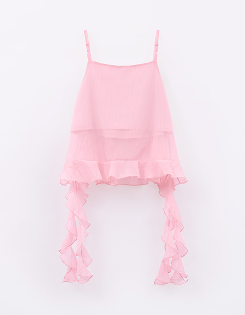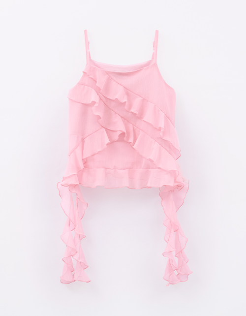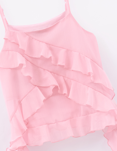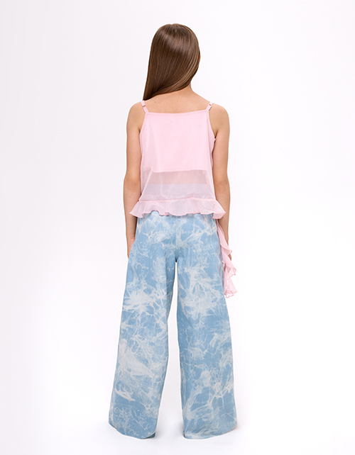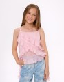 Блузка розового цвета на регулируемых бретелях для девочки. Прилегающий силуэт подчёркивает аккуратную посадку. Романтичные воланы с отсылкой к бохо создают лёгкий акцент. Внутри - топ из кулирной глади, чтобы не просвечивала.