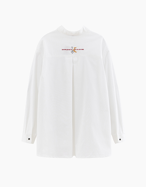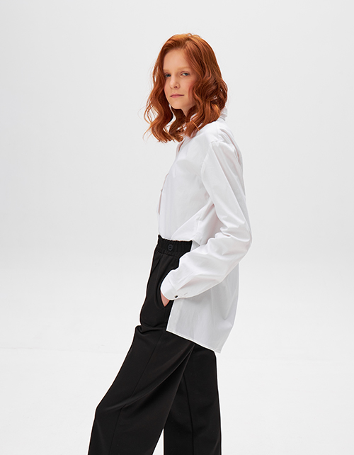 Стильная школьная белая блузка с длинным рукавом для девочки. Комфортная удлинённая модель А-образного силуэта. Изделие из поплина с разрезами в боковых швах. Блузку можно носить полностью или частично вправив, или навыпуск.
