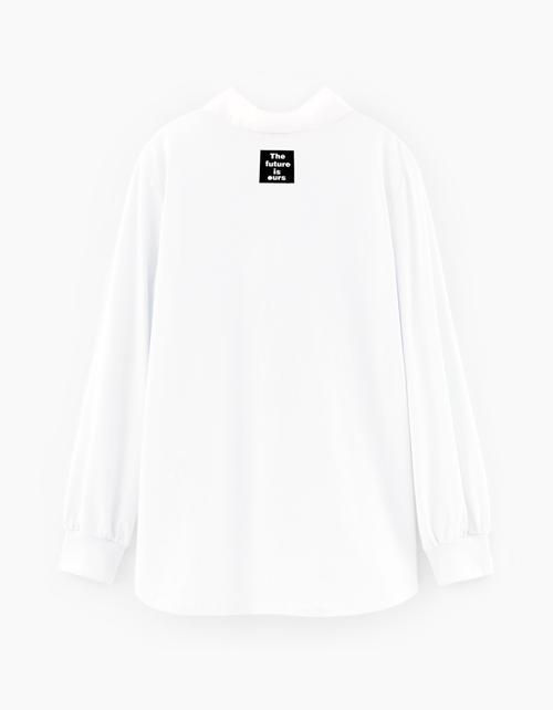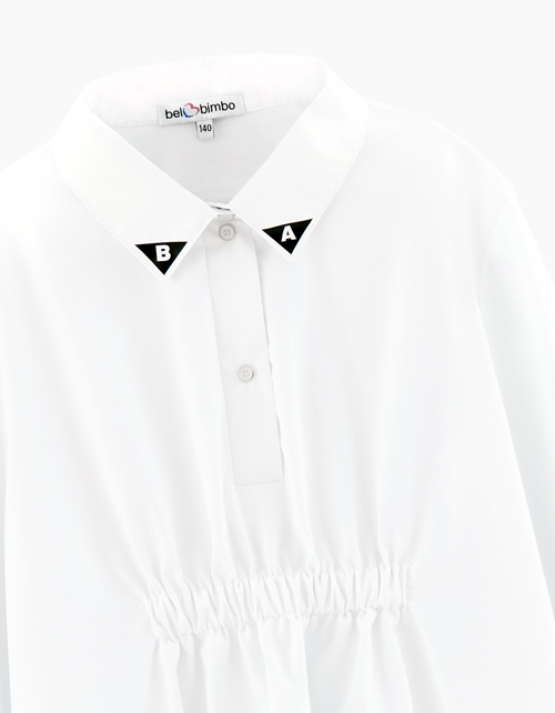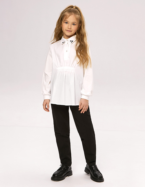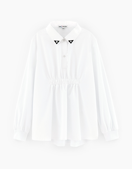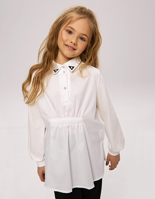 Стильная белая удлиненная блузка. Модель со стильным декоративным элементом в виде сборки под застежкой-поло.
