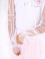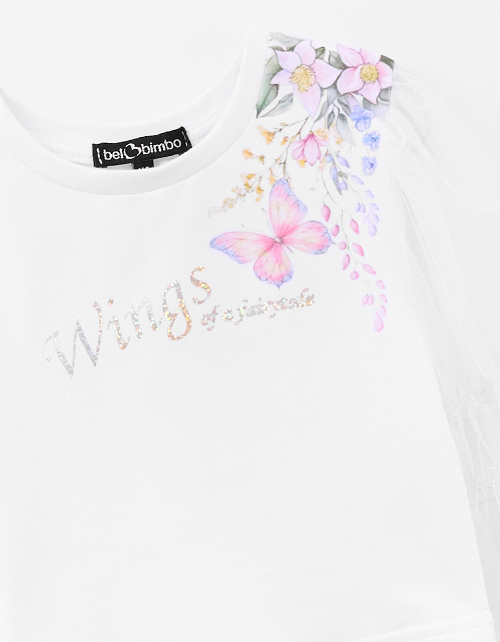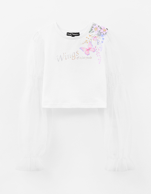Укороченная белая блузка из кулирки и мягкой сетки. Прилегающий силуэт создаёт аккуратную посадку, воздушные рукава дают летящий эффект. Декор - цифровая флоральная печать и шрифтовая плёнка.