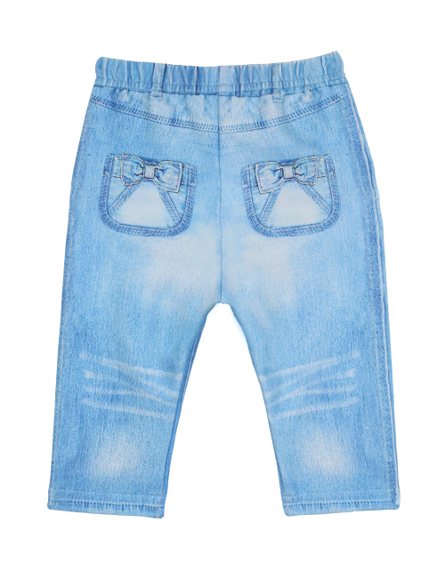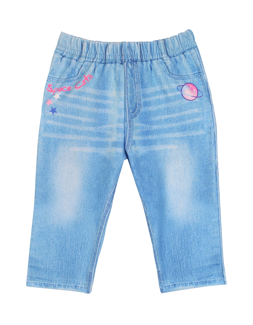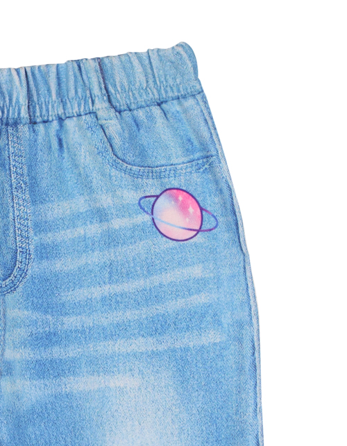 Брюки для девочки на резинке с имитацией джинсы. Дизайнерское оформление в стиле "Space Cat". Имитация передних и задних карманов, декоративные банты.