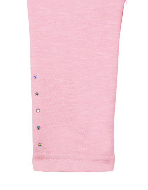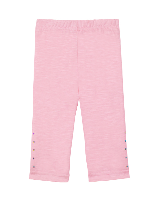 Розовые брюки на резинке для девочки. Модель декорирована стразами, расположенными внизу штанин. Брюки выполнены из эластана и хлопка.