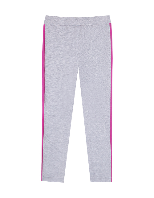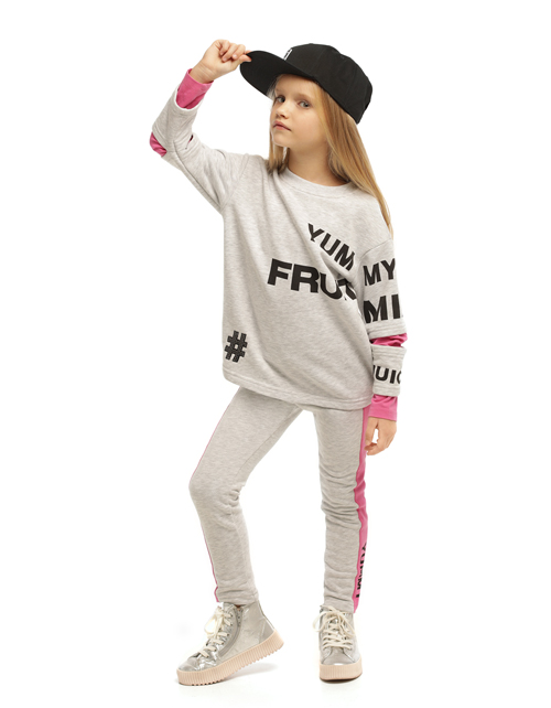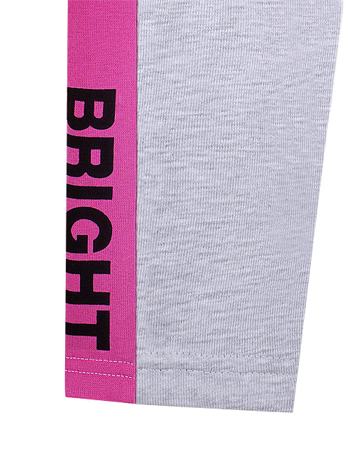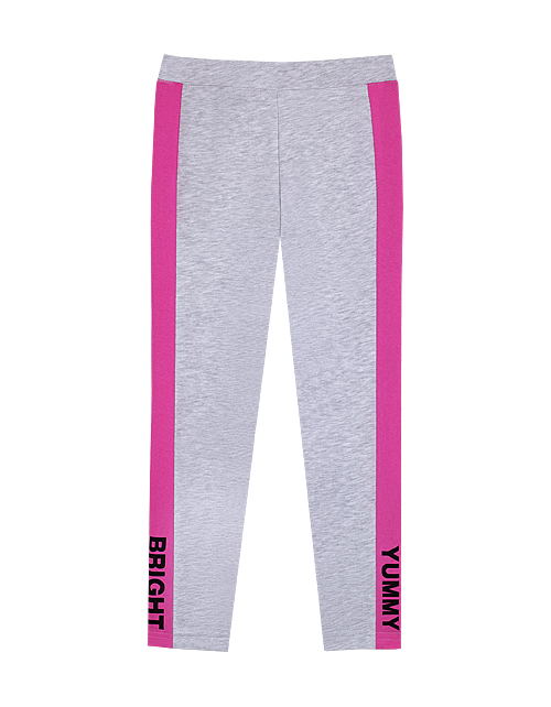 Брюки для девочки цвета светлый меланж на резинке. Розовые лампасы. Принты-надписи в стилистике капсулы "Фруктовый микс".