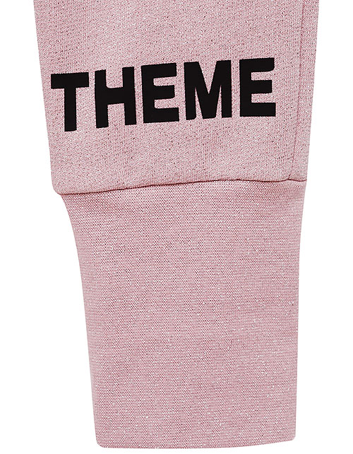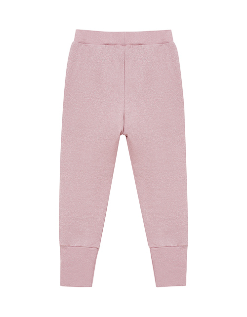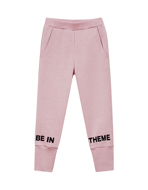 Светло-розовые брюки для девочки. Пояс и манжеты из рибаны. Карманы на лицевой стороне. Принт-надпись в стилистике капсулы "Модная тусовка".