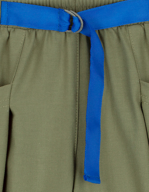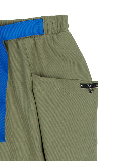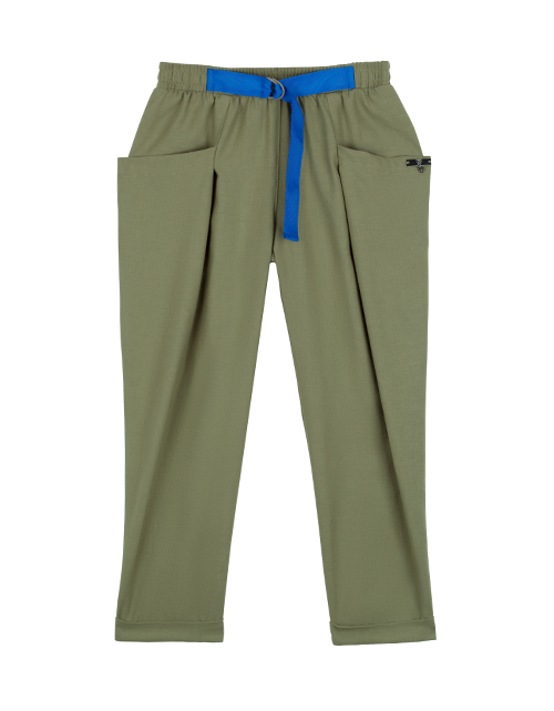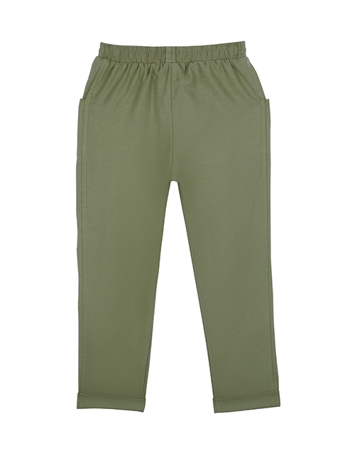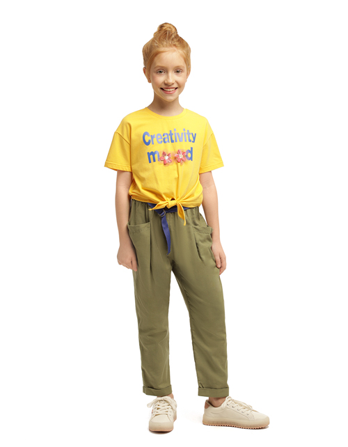 Брюки для девочки цвета светлая олива. Свободный, зауженный книзу силуэт с эластичной талией. Затягивающийся ремешок на поясе. Функциональные передние карманы. Манжеты по низу брюк. Оформление в стилистике капсулы "Цветочное сафари".