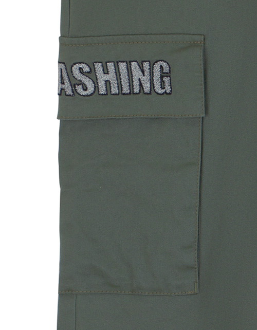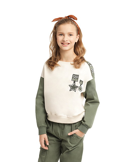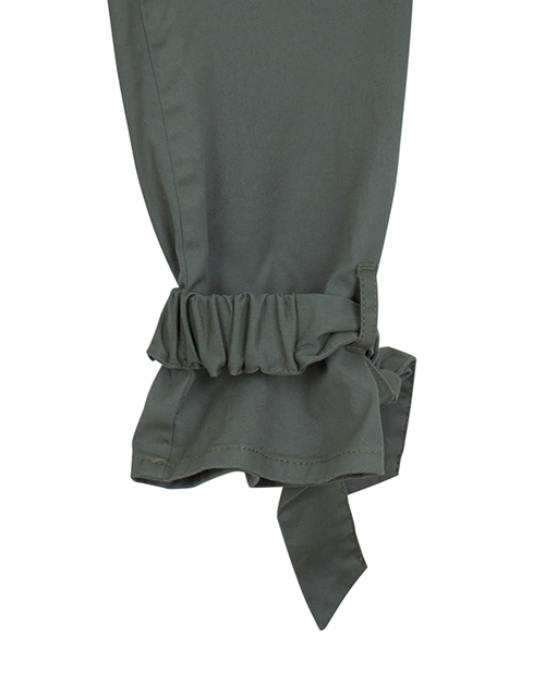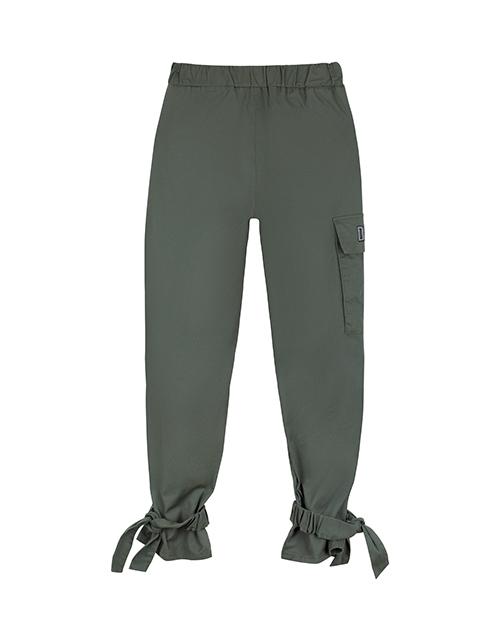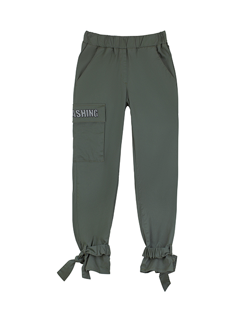 Брюки для девочки цвета хаки на резинке. Регулировка ширины штанин. Карман на лицевой стороне с дизайнерской вышивкой в стилистике капсулы "Армия стиля".