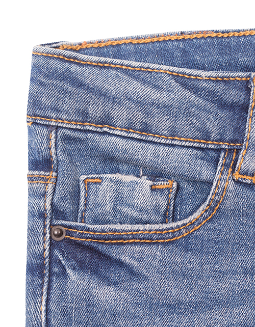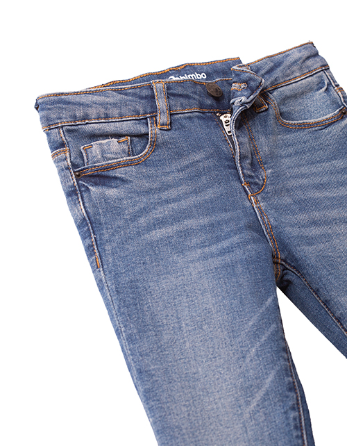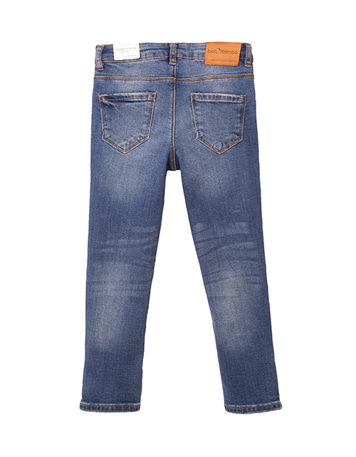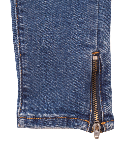 Классические темно-синие джинсы для девочки зауженного силуэта. Изделие дополнено застежкой на молнии с пуговицей и пятью карманами. Декоративные молнии в нижней части штанин.