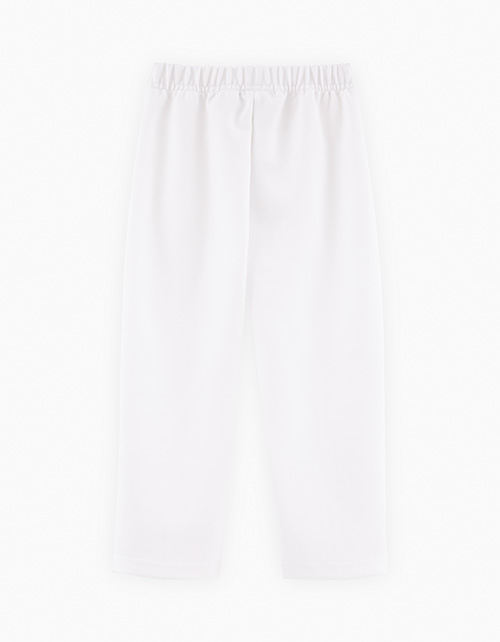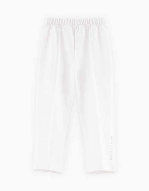 Брюки джерси оттенка молоко для девочки. Модель со строчками, прямого силуэта, со средней посадкой. Мягкий эластичный пояс. Деликатный декор в виде авторской трансферной печати. Стильный образ с артикулами 242201 и 242203.