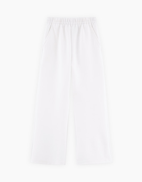 Брюки джерси оттенка молоко для девочки. Прямая широкая модель. Изделие на мягком эластичном поясе, со средней посадкой. Брюки дополнены карманами-хулиганами.