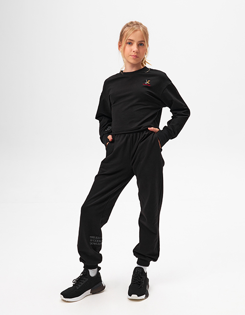 Чёрные брюки-джоггеры для девочки. Прямая модель со средней посадкой. Изделие из футера, с рибаной по низу. Джоггеры комфортны для занятий спортом.
