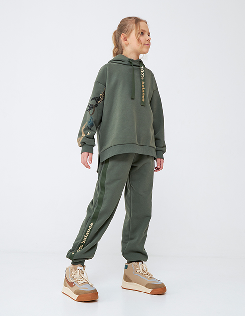 Брюки-джоггеры в трендовом оттенке листа шалфея для девочки. Комфортная модель прямого силуэта со средней посадкой. Изделие на мягком поясе. Манжеты из рибаны. Наклонные карманы. Брюки из бархатистого футера. Декорированы лампасами из киперной ленты.