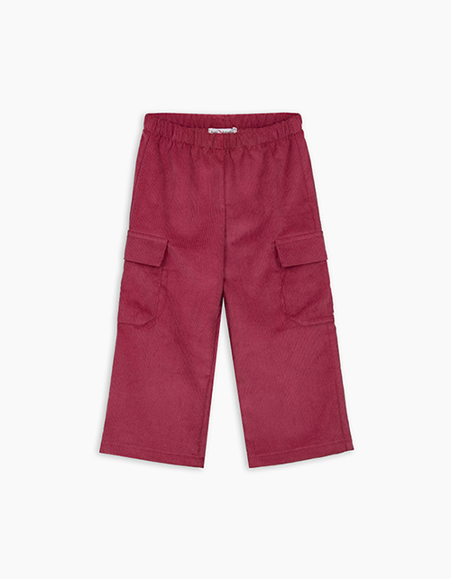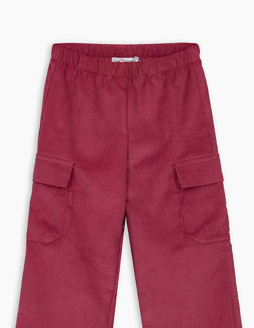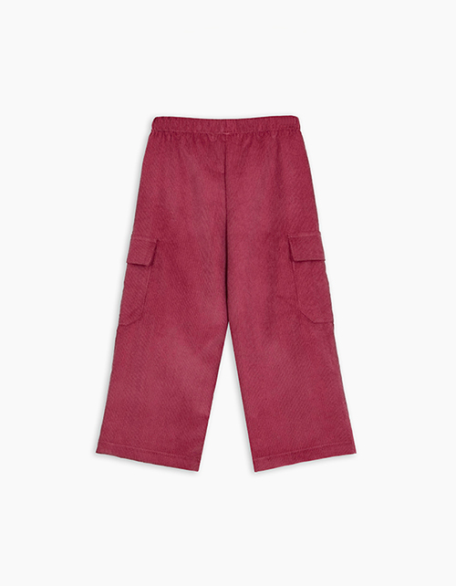 Актуальные широкие брюки-карго в сочном оттенке клюква для девочки. Модель прямого силуэта, со средней посадкой. Изделие без застёжки, на мягком эластичном поясе. Брюки из микровельвета, с накладными карманами с клапаном.