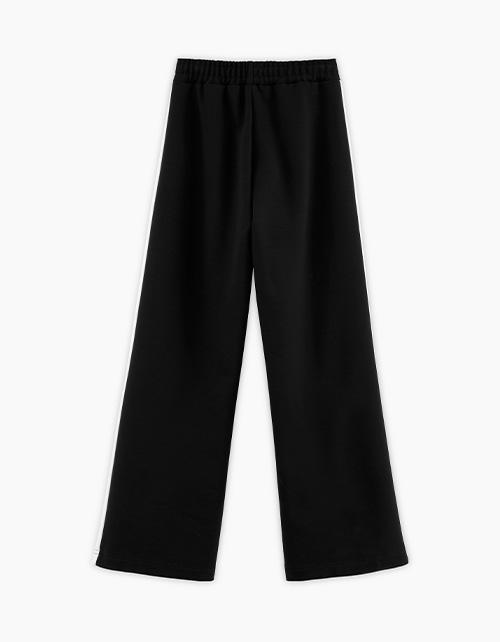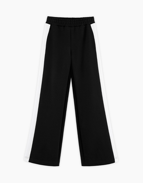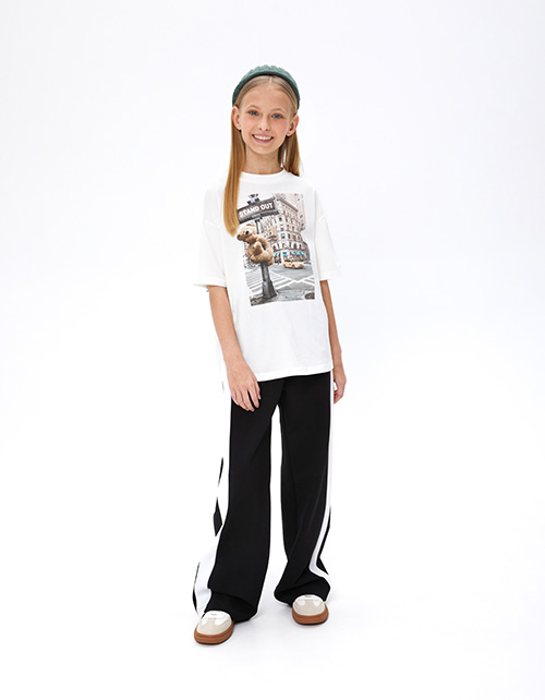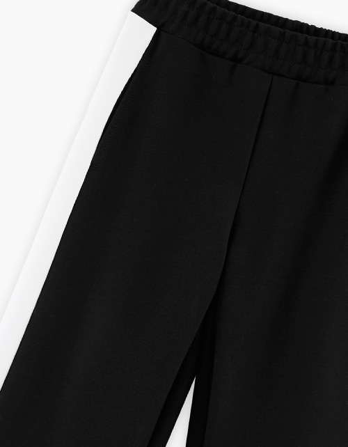 Трендовые чёрные брюки джерси для девочки. Прямая модель со средней посадкой. Изделие без застежки, на мягком эластичном поясе. Брюки с декоративными контрастными вставками по всей длине по бокам. Карманы в боковом шве.