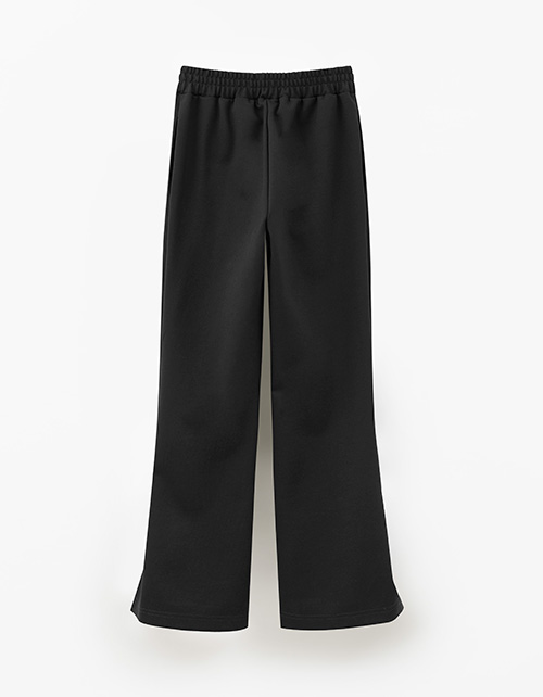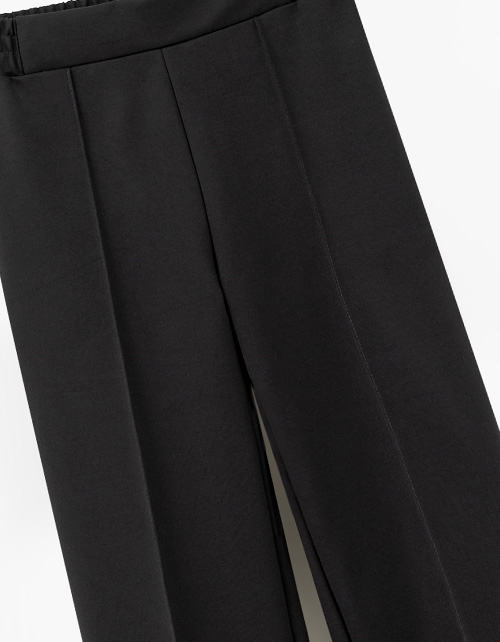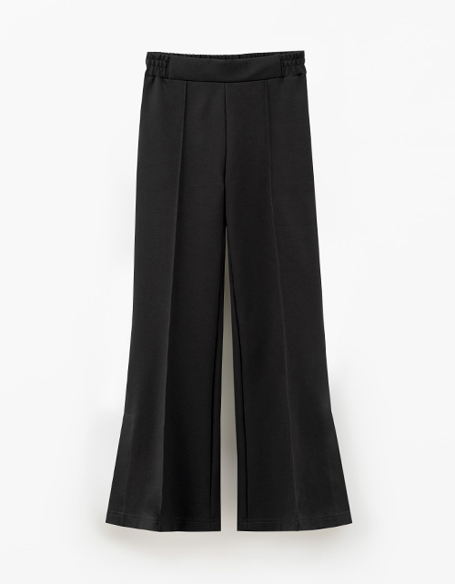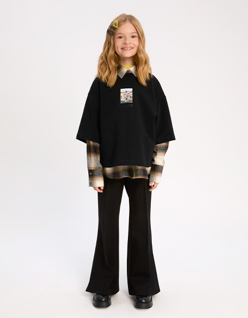 Чёрные брюки-клёш с разрезами внизу для девочки. Модель со средней посадкой. Изделие на эластичном поясе с регулировкой объёма. Брюки дополнены карманами в швах. Стильный образ с лонгсливом 252106 и свитшотом с коротким рукавом 252108.