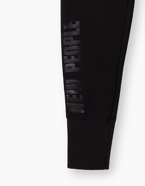 Брюки свободного спортивного силуэта с широкими манжетами для девочки. Выполнены из черного футера и рибаны. Удобные прорезные карманы по бокам, комфортный пояс на эластичной ленте. Декорированы шрифтовым трансфером из черной пленки с правой стороны