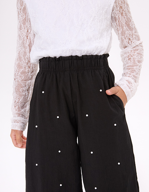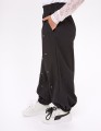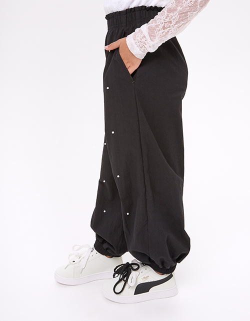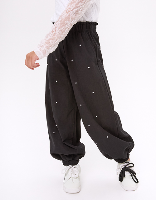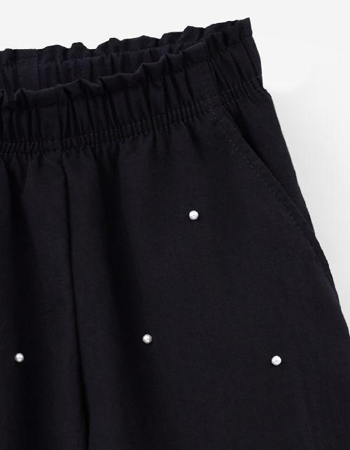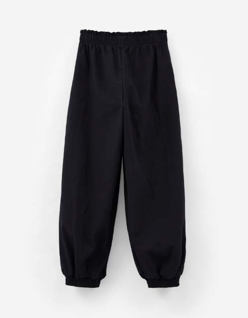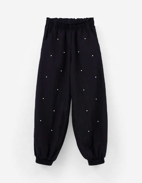 Чёрные джоггеры из мягкого поплина создают расслабленный, удобный силуэт. Объёмная форма не мешает активности. Длина до косточки смотрится аккуратно и подчёркивает задуманный стиль. Боковые карманы добавляют пользы. Жемчужные акценты делают образ нежнее.