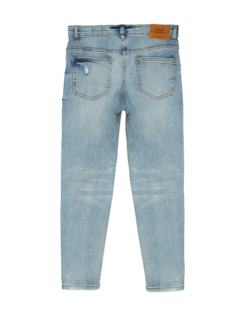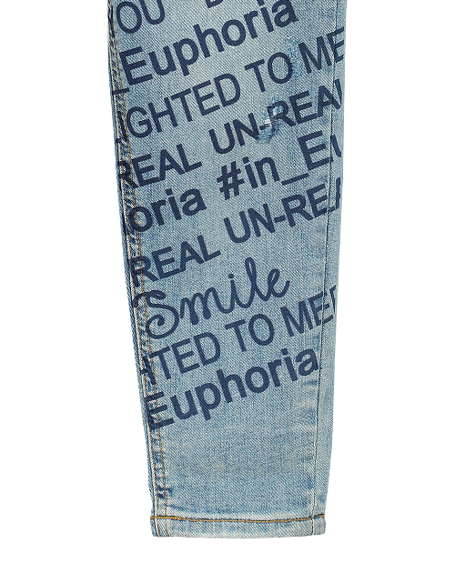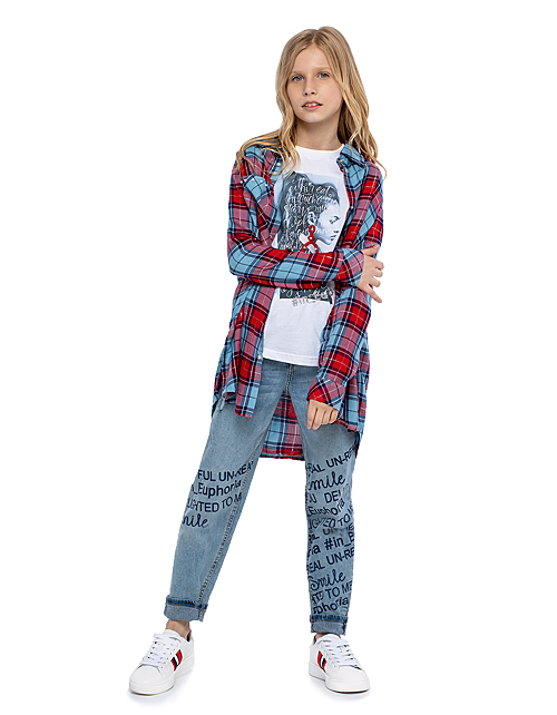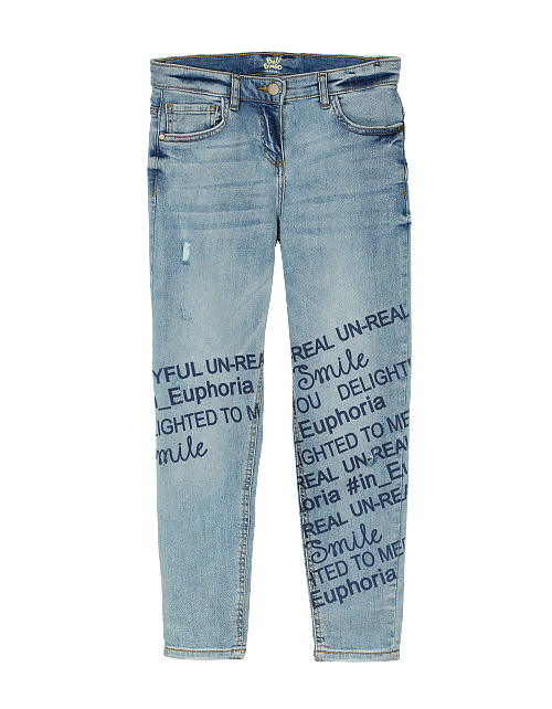 Джинсовые брюки для девочки зауженного силуэта дополнены подворотами, застежкой молнией, пятью карманами и стильным принтом в виде надписей. Джинсовая ткань гарантирует износостойкость изделия и приятные тактильные ощущения.
