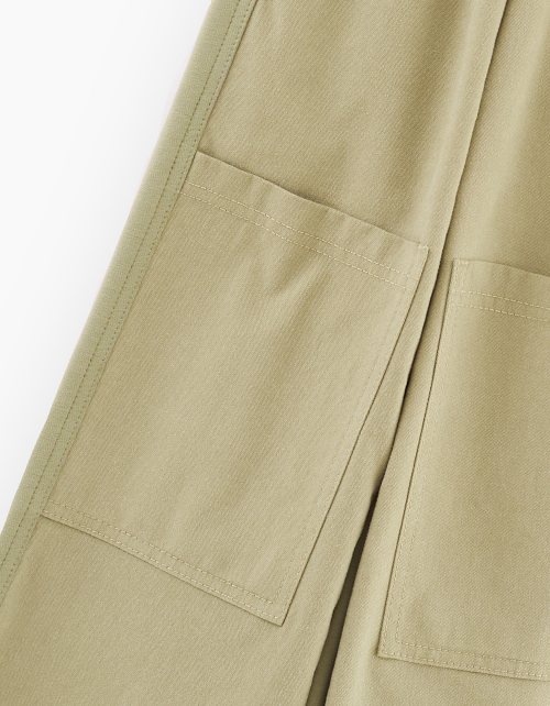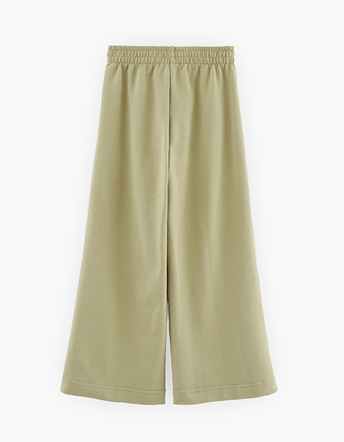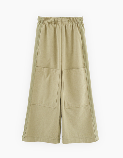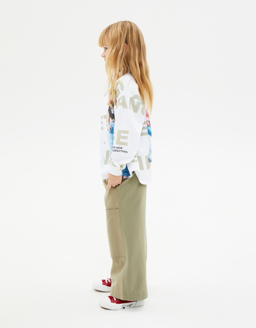 Стильные широкие брюки в оригинальном оттенке светлая олива для девочки. Модель прямого силуэта, со средней посадкой. Комбинация материалов: твил и футер. Изделие без застёжки, на мягком поясе. Брюки с карманами в швах и накладными спереди.
