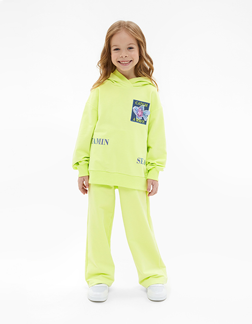 Широкие брюки оттенка киберлайм. Прямая модель. Изделие на мягком поясе со средней посадкой. Карманы хулиганы. Брюки из футера с бархатистым эффектом. Декорированы дизайнерским шрифтовым принтом. Декоративная плёнка меняет оттенок при разном освещении.