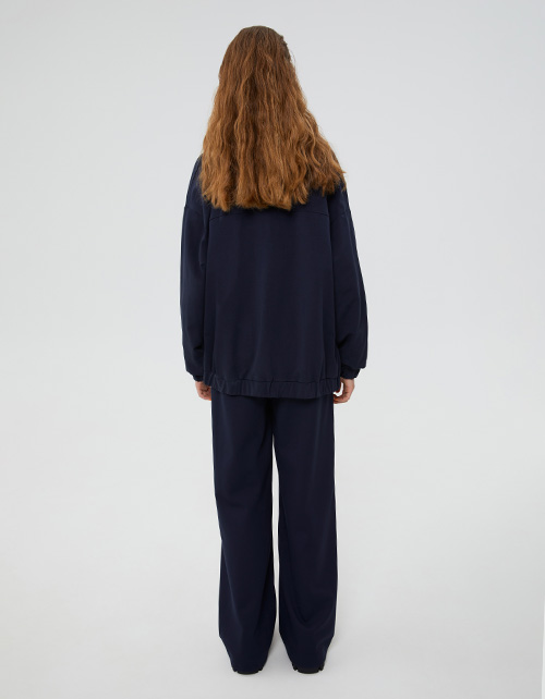 Широкие тёмно-синие школьные брюки для девочки. Модель из трикотажного полотна. Изделие со средней посадкой, на мягком поясе с регулировкой. Карманы в боковых швах. Брюки с защипами спереди.