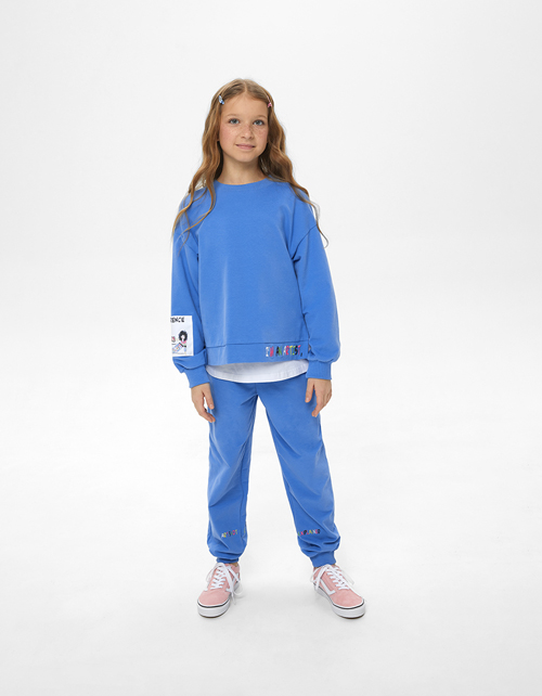 Стильные лазурные брюки-джоггеры для девочки. Широкая объёмная модель со средней посадкой на мягком поясе. Брюки из футера с браш-эффектом, что делает их мягкими и износостойкими. Джоггеры с манжеты внизу декорированы вышивкой в виде букв.
