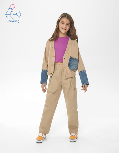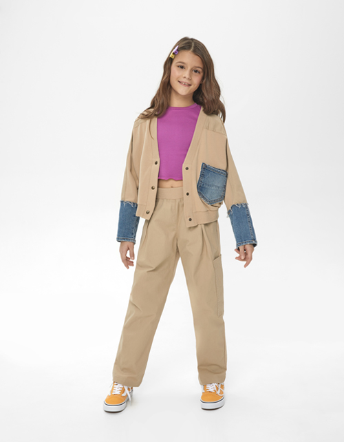 Актуальные модные светло-бежевые брюки для девочки. Прямая модель, слегка зауженная к низу, со средней посадкой. Изделие с карманами и на мягком поясе. Брюки из твила+футера с браш-эффектом, что делает их мягкими и износостойкими.
