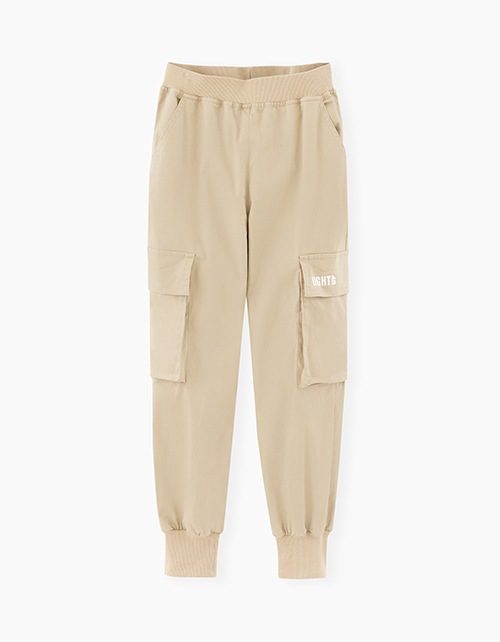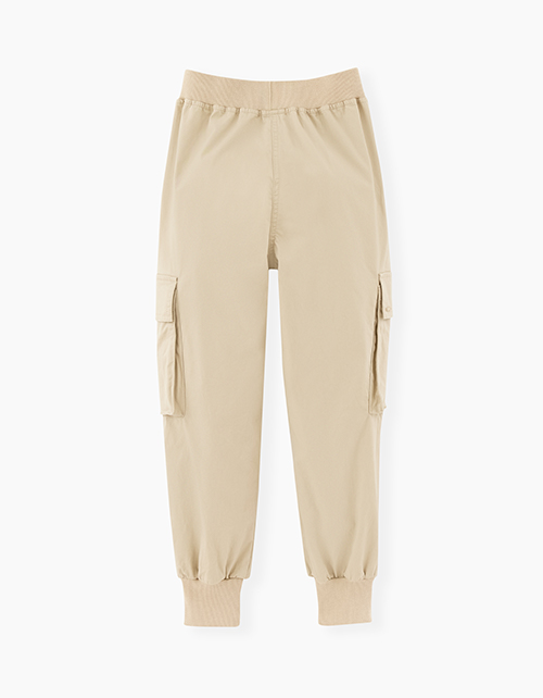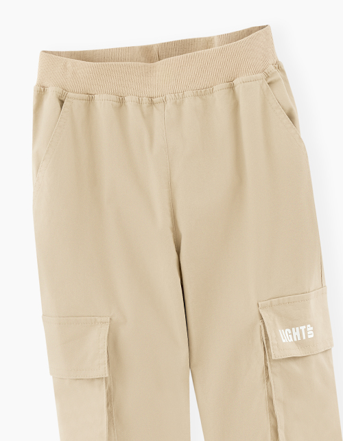 Комфортные светло-бежевые брюки-карго для девочки. Повседневная модель на эластичном поясе с накладными и боковыми карманами.