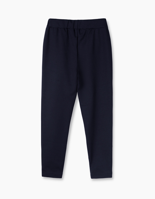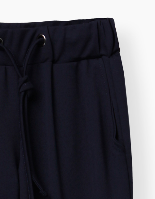 Темно-синие зауженные к низу брюки. Эластичный пояс. Боковые карманы. Пояс внутри на эластичной ленте с дополнительной регулировкой отделочной трикотажной тесьмой. Часть лимитированной школьной капсулы.