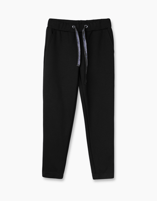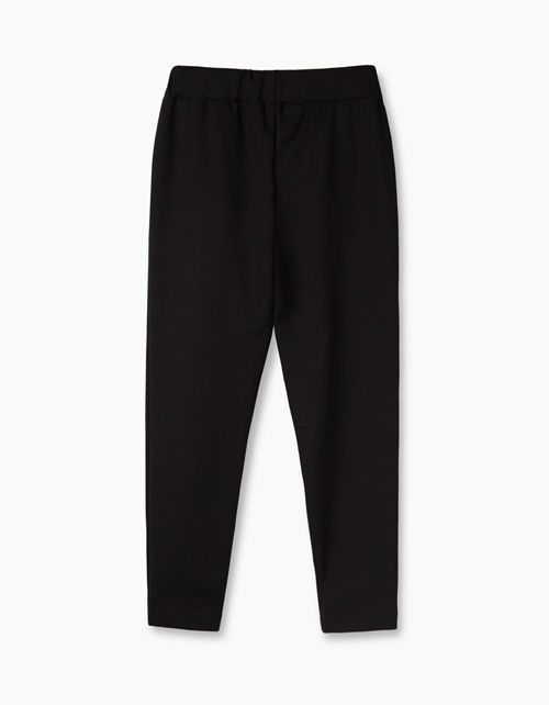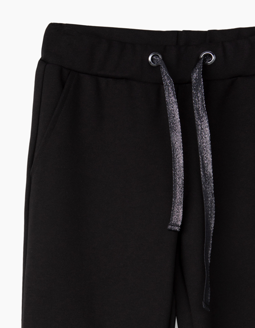 Черные зауженные к низу брюки для девочки.  Эластичный пояс. Боковые карманы. Пояс внутри на эластичной ленте с дополнительной регулировкой отделочной трикотажной  тесьмой. Часть лимитированной школьной капсулы.