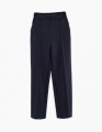 Зауженные к низу тёмно-синие школьные брюки для девочки. Укороченная модель из трикотажного полотна. Изделие со средней посадкой на мягком поясе с регулировкой. Карманы-хулиганы. Изделие со стрелками.