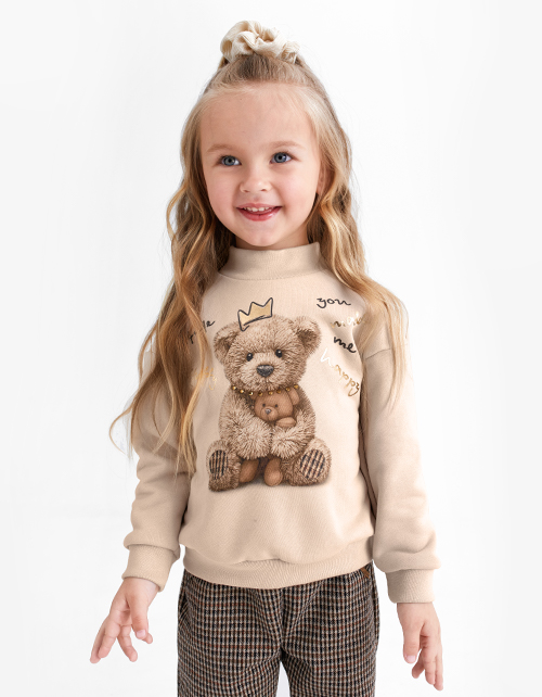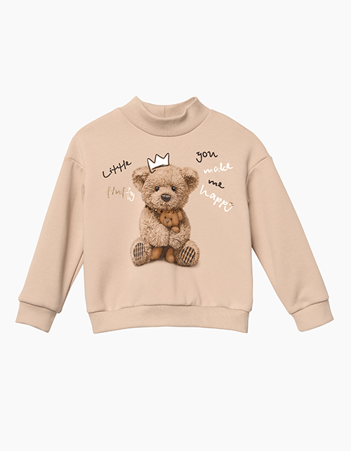 Свободный бежевый свитшот для девочки. Декорирован принтом в виде мишки Тэдди, надписями в тематике капсулы и золотыми стразами. Отлично сочетается с жаккардовыми брюками.
