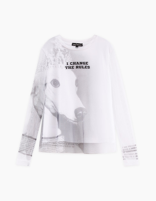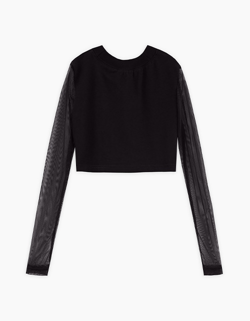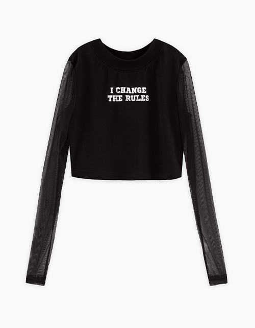 Стильный укороченный чёрный лонгслив для девочки. Модель прилегающего силуэта. Горловина из эластичной рибаны. Комбинация материалов: кулирная гладь и мягкое сетчатое полотно. Лонгслив декорирован авторской трансферной печатью.