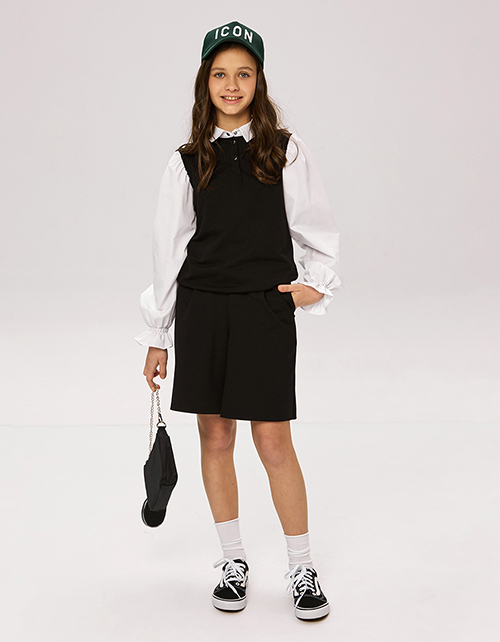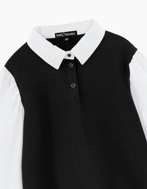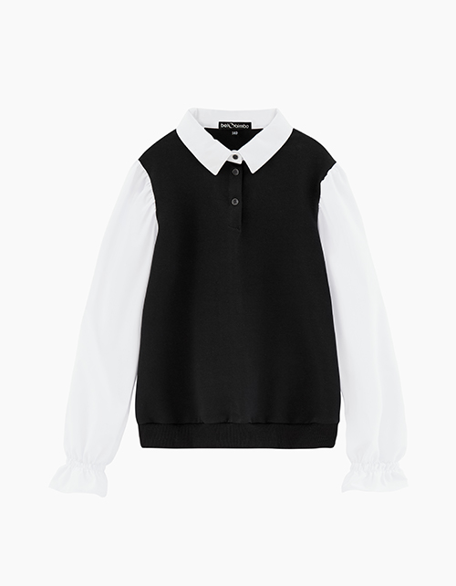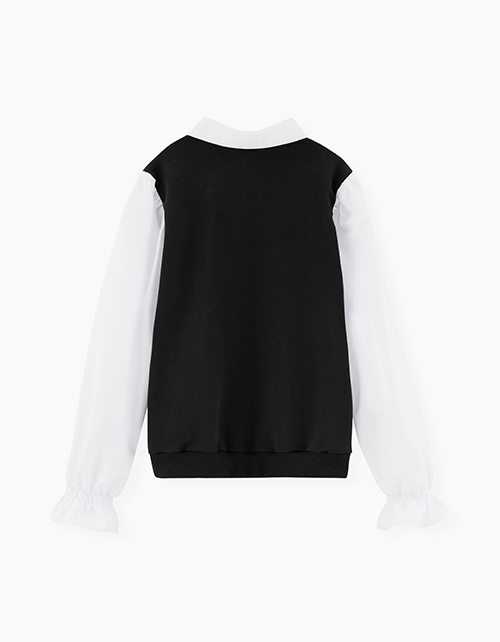 Черный школьный джемпер-обманка для девочки. Функциональная повседневная модель с удобной застежкой поло на кнопки. Объемные рукава, низ которых оформлен рюшей.