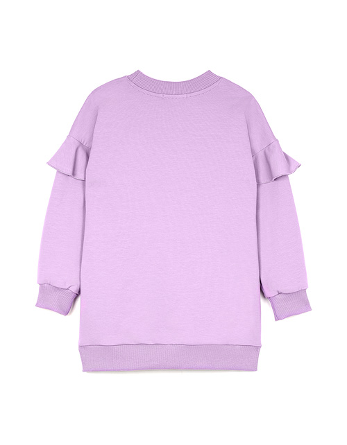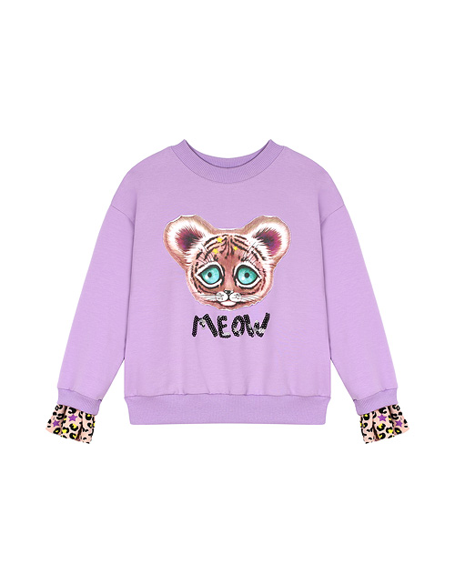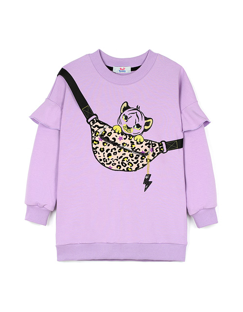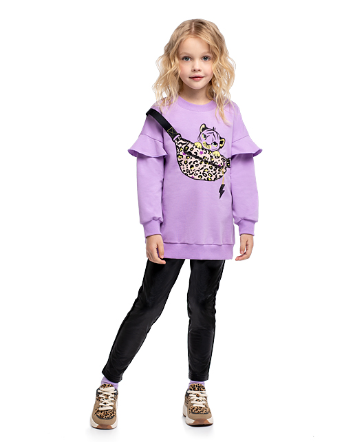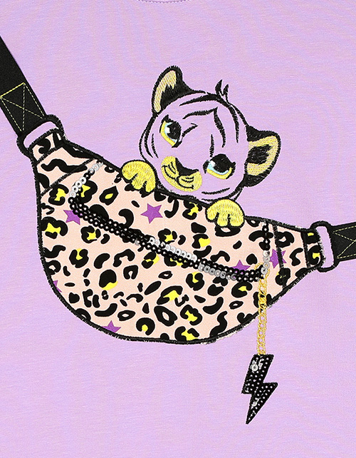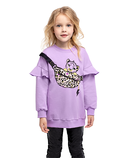 Джемпер для девочки имеет свободный силуэт, длинный рукав и круглый вырез горловины. Изделие дополнено принтом с сумкой и тигренком, а на рукавах - отлетными элементами в виде крылышек и удобными манжетами. Ткань футер дарит комфорт в носке.