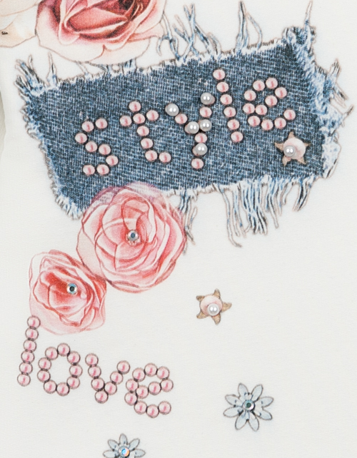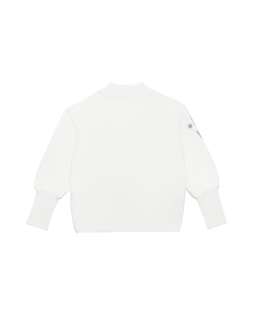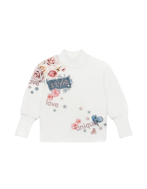 Джемпер для девочки имеет свободный силуэт и дополнен стильным цветочным принтом с пайетками, высоким воротником и широкими удобными манжетами. Трикотажная ткань футер износостойкая и дарит приятные тактильные ощущения.