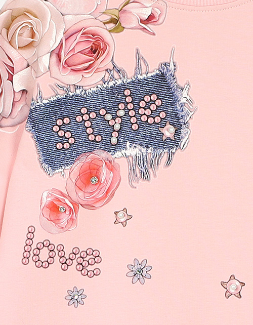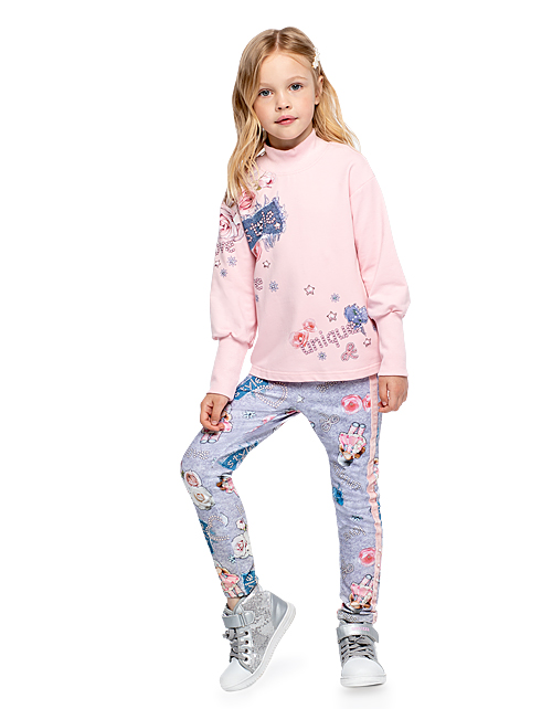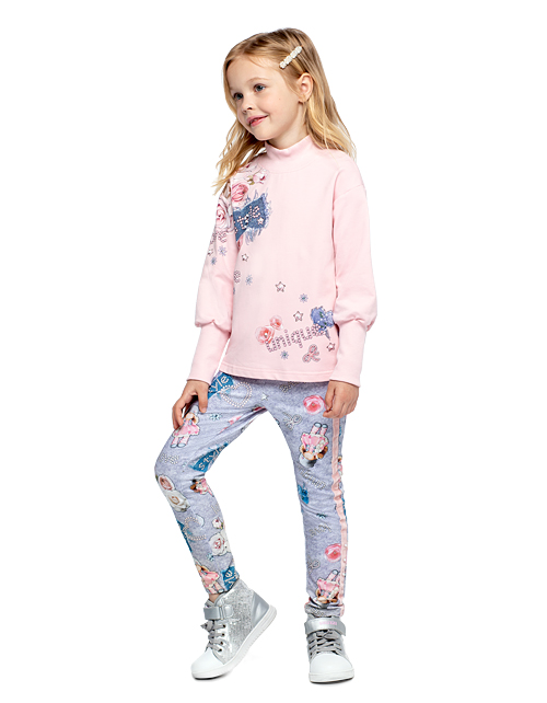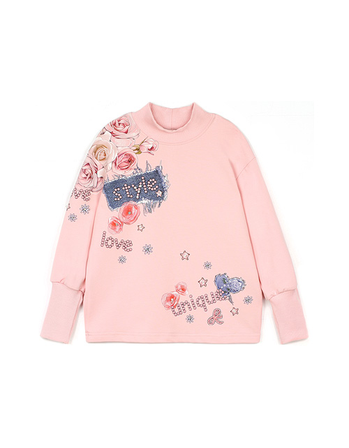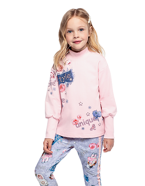 Джемпер для девочки имеет свободный силуэт и дополнен стильным цветочным принтом с пайетками, высоким воротником и широкими удобными манжетами. Трикотажная ткань футер износостойкая и дарит приятные тактильные ощущения.