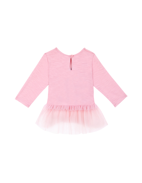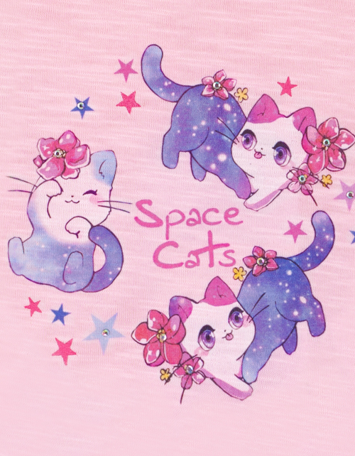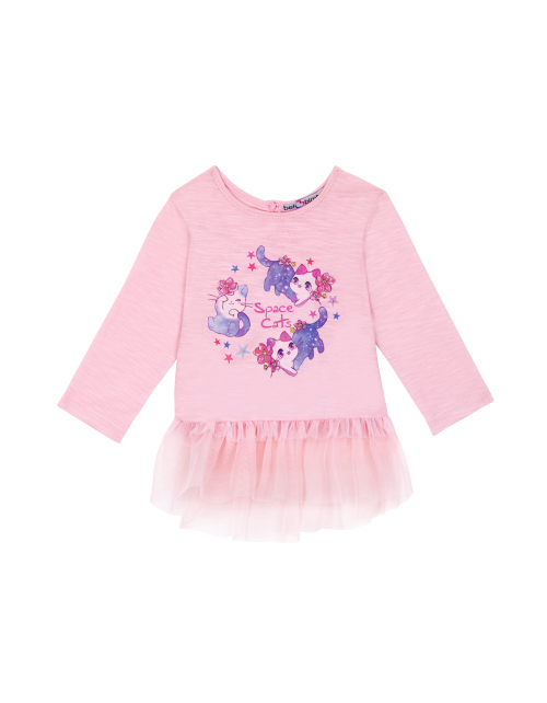 Розовый джемпер с длинным рукавом для девочки. Декоративная юбка из сетчатого полотна. На лицевой стороне принты тематики "Space Cat". На спине присутствует застёжка на пуговице.
