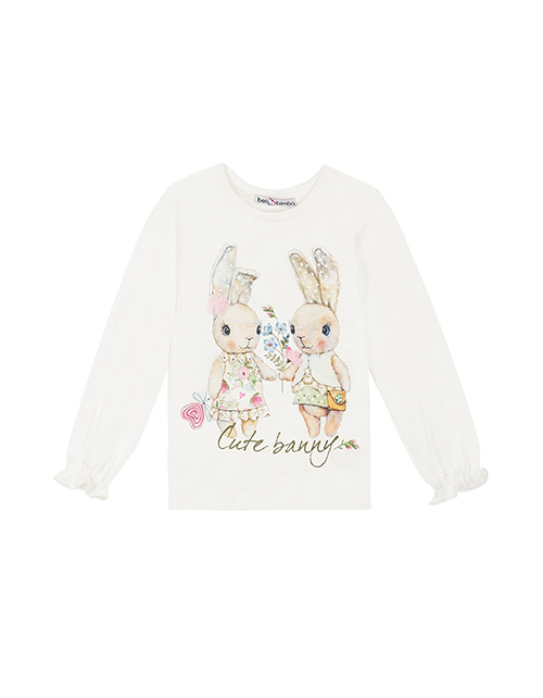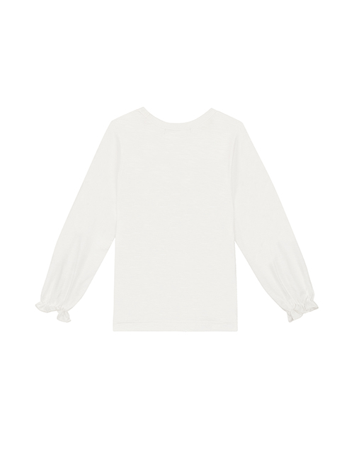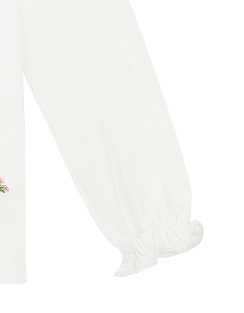 Повседневный молочный джемпер для девочки прямого силуэта с длинным рукавом и круглым вырезом горловины. На лицевой стороне присутствует принт с надписью. Нижняя часть рукавов дополнена оборками.