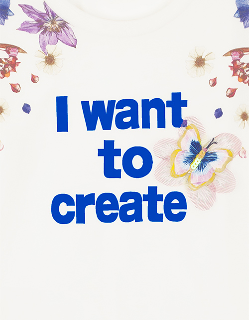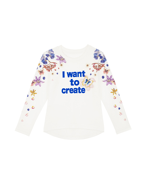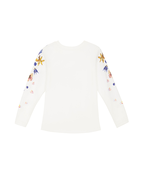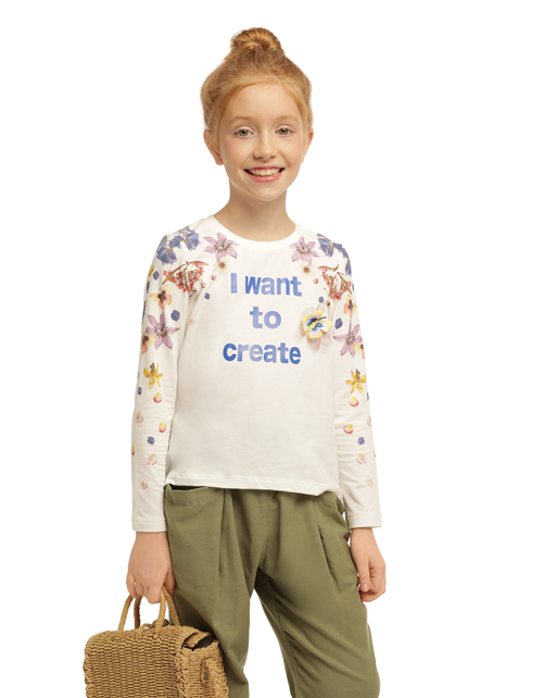 Джемпер для девочки цвета молоко. Круглый вырез горловины. Принт в стилистике капсулы "Цветочное сафари". Дизайнерская нашивка.
