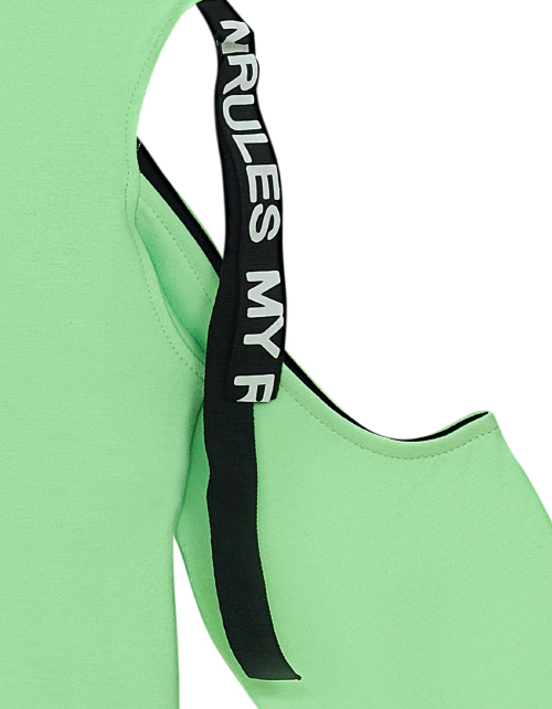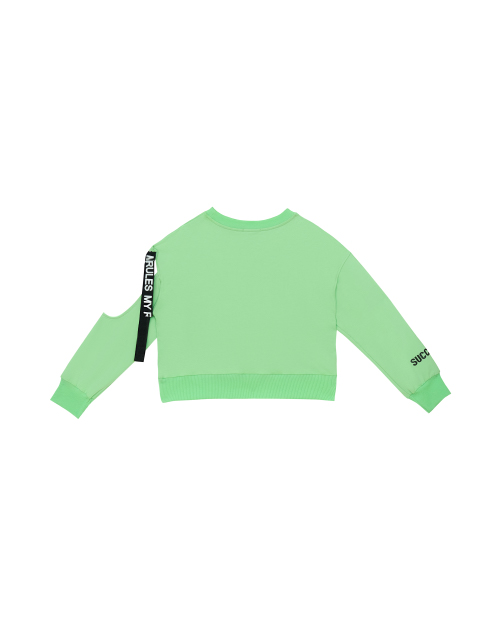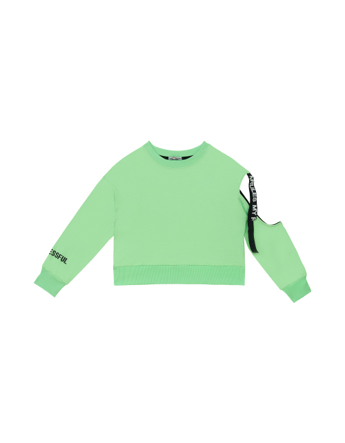 Джемпер для девочки цвета яблоко. Круглый вырез горловины. Ребристые манжеты и резинка. Декоративный вырез и вставка на рукаве. Принт-надпись в стилистике капсулы "На своей волне".
