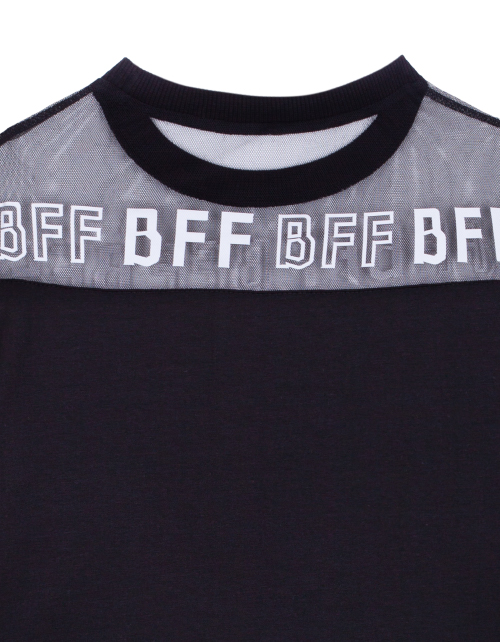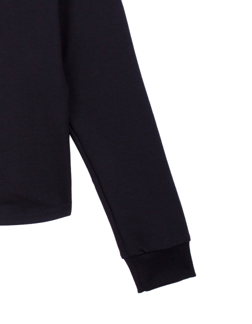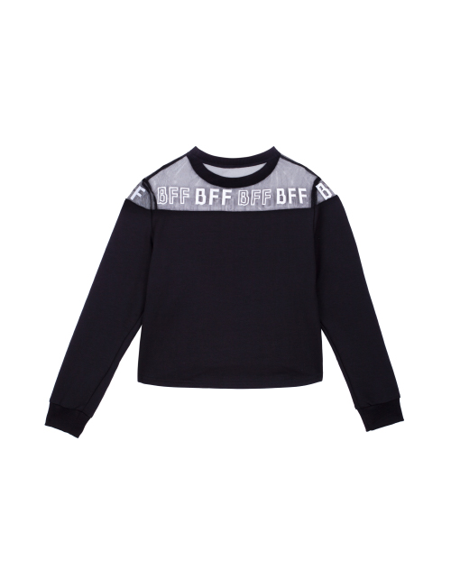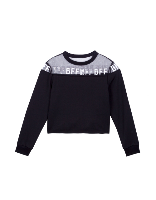 Черный джемпер для девочки с круглым вырезом горловины. Вставка из сетчатого полотна с принтом-надписью в стилистике капсулы "Кот-Арт". Укороченный низ. Манжеты из рибаны.