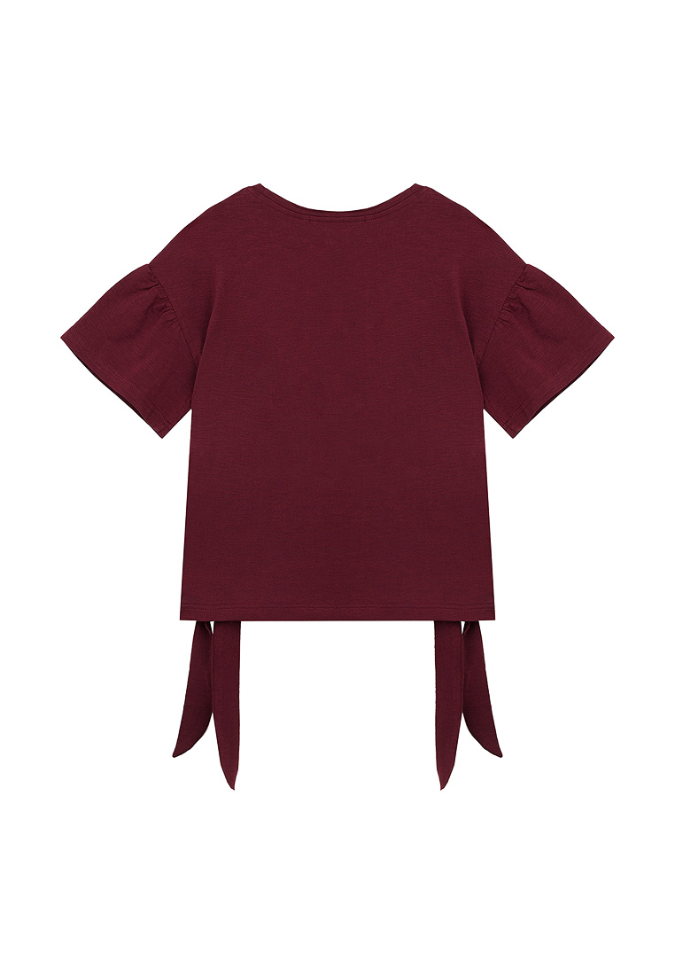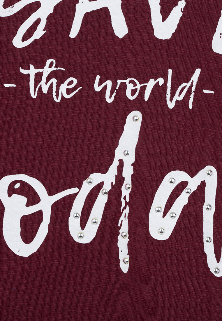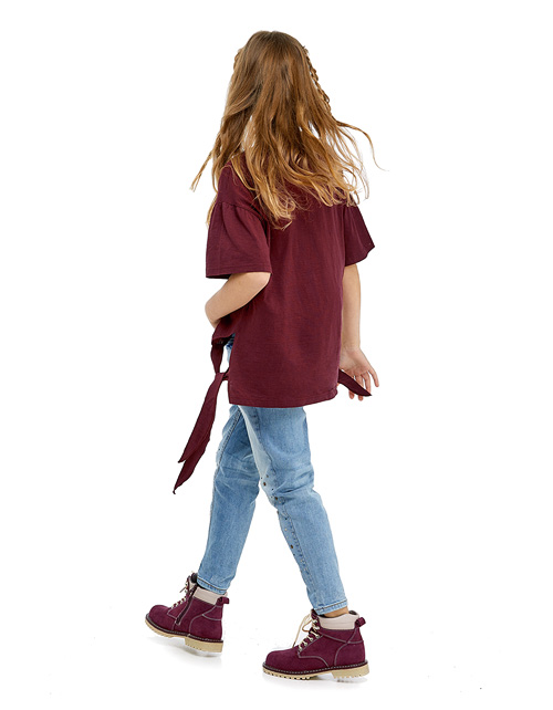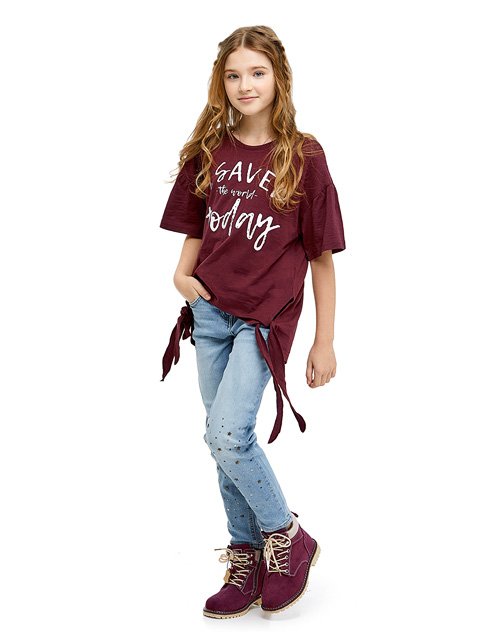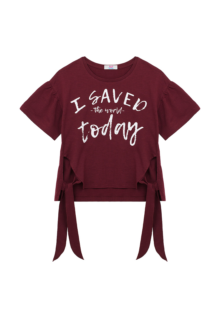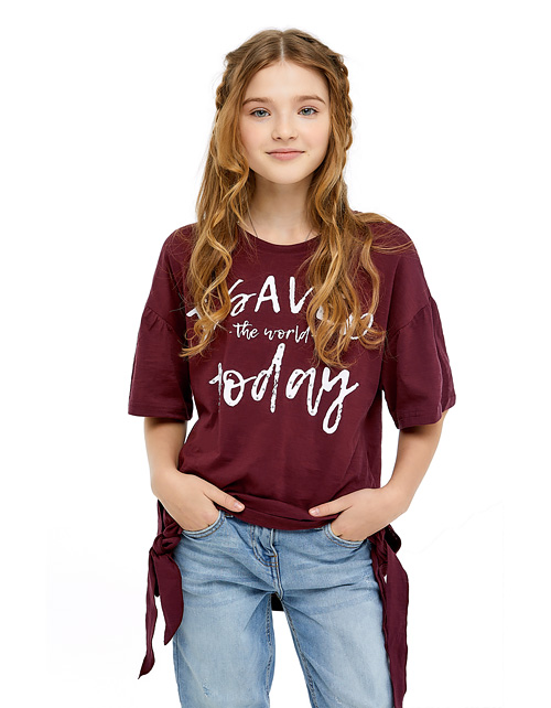 Стильная футболка из мягкой ткани подарит лёгкость и комфорт даже в жаркий день. Модная форма, спущенная линия плеча и разрезы с завязками делают модель оригинальной. Шрифтовой принт с надписью "Я спасу этот мир сегодня" подчеркнёт индивидуальность девочк
