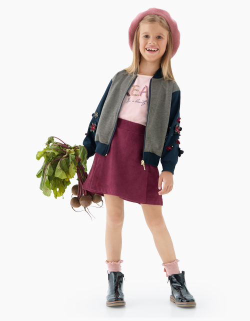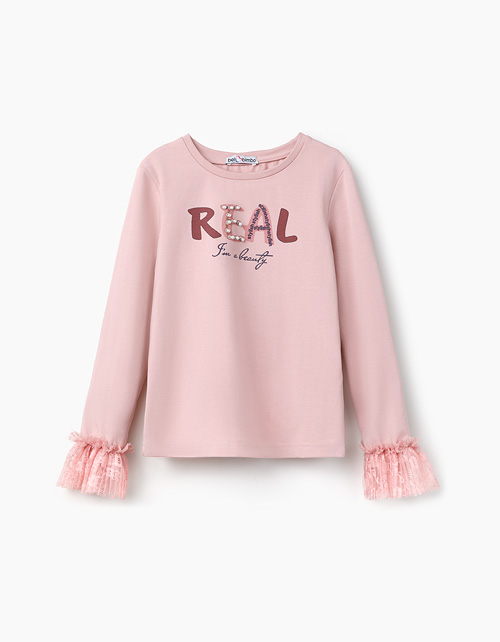 Трикотажный джемпер темно-розового цвета для девочки. Полуприлегающего силуэта. Рукава декорированы сетчатым полотном.