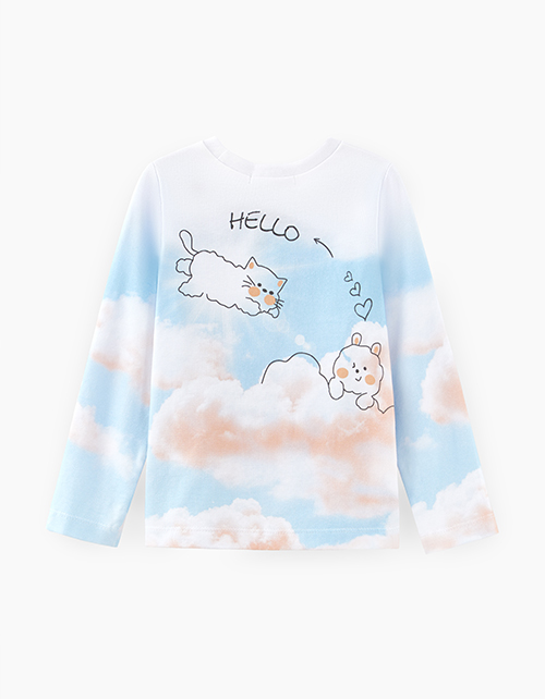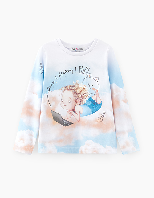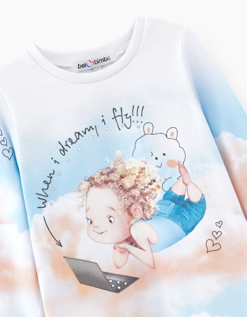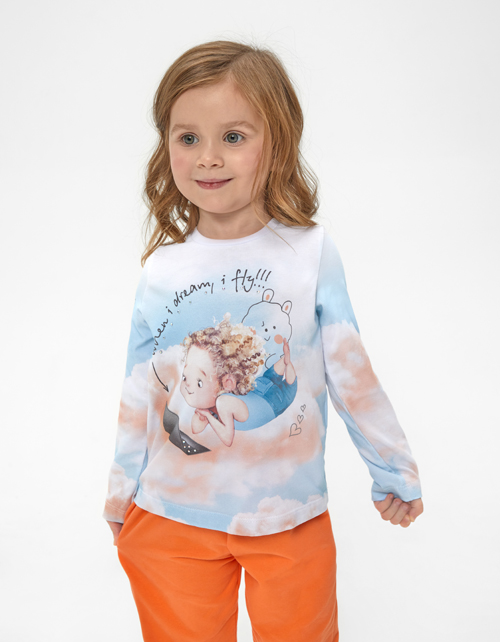 Уютный лонгслив с тематическим авторским принтом для девочки. Модель из кулирной глади, с круглой горловиной, декорирована стразами.